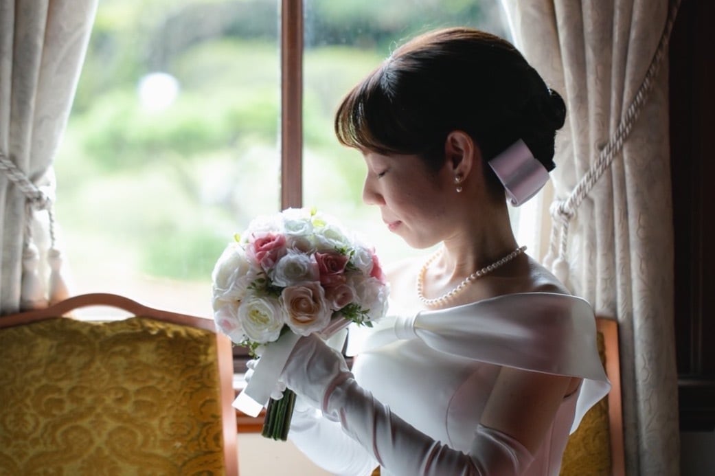 ドレスと和装、どちらにも合わせやすいブーケです。 直径約23㎝ 花部分高さ約18㎝ 茎長さ約16㎝ クラッチブーケ(茎を魅せるタイプ) [使用花材]芍薬・バラ・ダリア・紫陽花・デルフィニウム・ネリネ 花びらのフリルが軽やかな芍薬を贅沢に7輪使っています。敢えて花材を均等に配置しないことで見る方向によって少しずつ変わる横顔をお楽しみください。 完成品販売のため花材変更はできません。リボンはホワイト、ピンク、パープルへの変更が可能です。