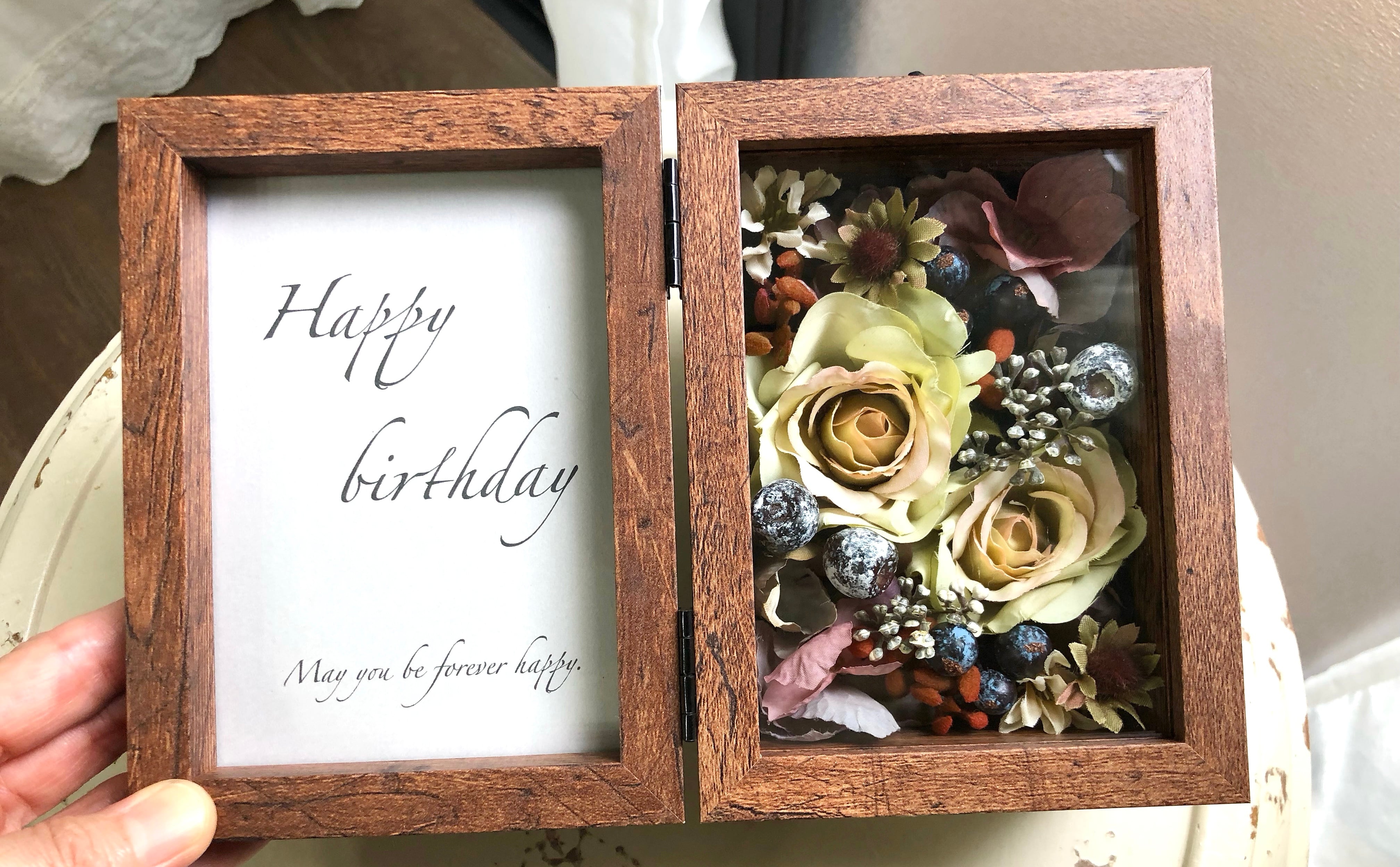 直径13cm 蓋を開けた状態の高さ約8cm 蓋を下に重ねた状態の高さ訳11.5cm 小さな空間に4種類のバラをギュッと敷き詰めました。「幸せや願いが実りますように」と想いを込めたブルーベリーの実、シックな色合いのシキミアをアクセントに効かせた甘すぎないフラワーボックスです。キレイがずっと続くアーティフィシャルフラワー(造花)だからお手入れの手間もかかりません。お祝いの贈り物にはもちろん、お世話になった方へのさりげない手土産や、自分のためのご褒美にもおすすめです。 ご希望があればラッピングをしてお届けいたします。購入手続きの際、備考欄に「ラッピング希望」とお書き添えください。尚、当店では過剰ラッピングを廃止しています。小さなことでも未来の地球のためにできることを・・と考えておりますのでご理解いただければ幸いです。